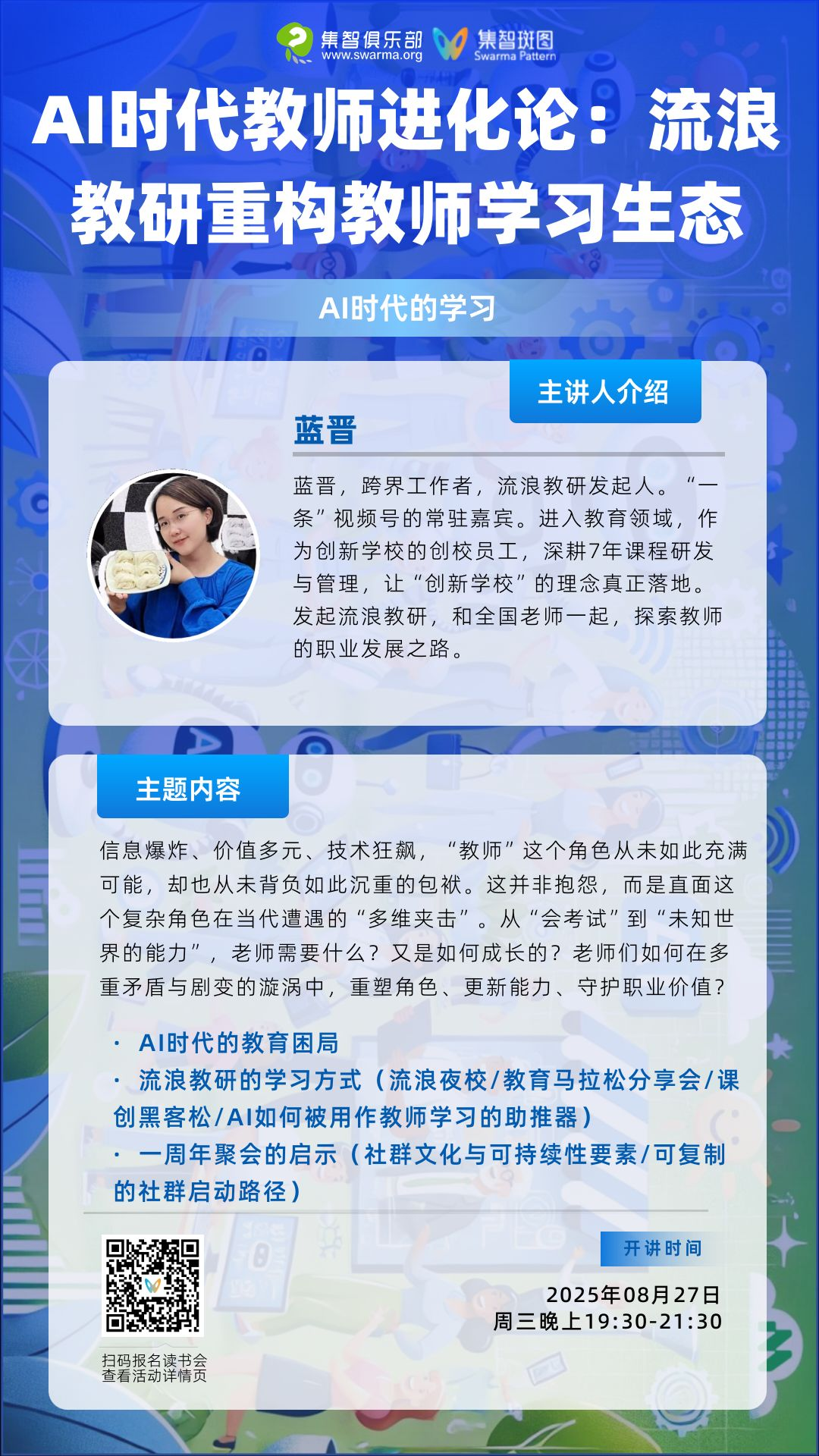 本次分享将从 AI 时代教育困局切入,拆解流浪教研的特色学习方式,更将结合社群一周年聚会的实践经验,提炼教师学习生态重构的核心逻辑:为更多教师群体提供 “从孤独成长到群体智造” 的行动参考,探索 AI 时代教师职业价值的新可能。