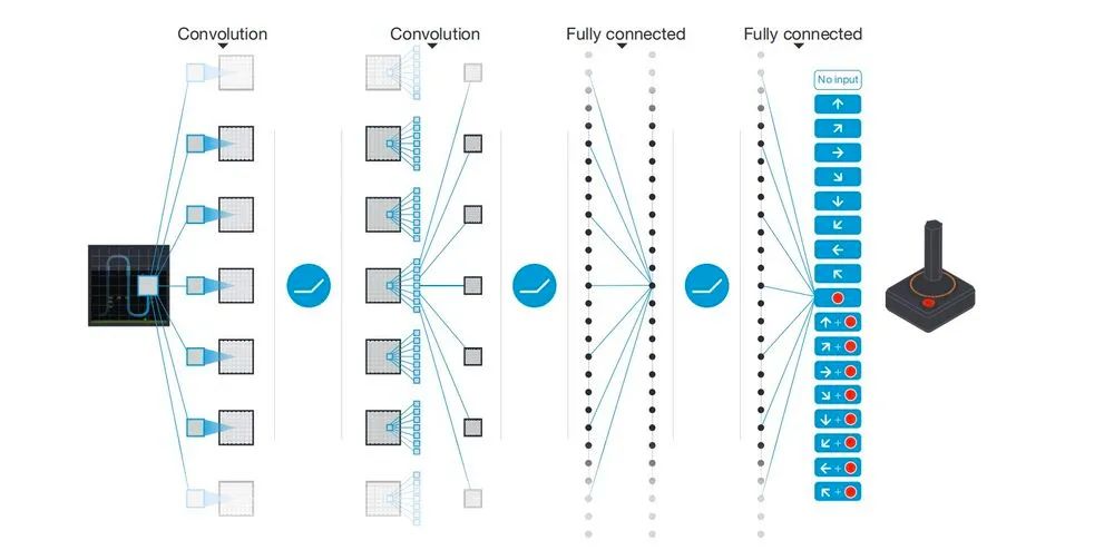 该示意图展示了深度Q网络(DQN)的典型架构设计,直观呈现了从原始游戏画面到控制指令的端到端处理流程。系统采用多级特征提取架构,左侧输入层接收预处理后的游戏画面(84×84像素,4帧堆叠),通过两个卷积层(Convolution)进行空间特征提取,其中网格状结构表示卷积核在空间维度上的特征映射过程。随后经由两个全连接层(Fully connected)实现高级特征的抽象与组合,最终输出层与游戏手柄控制指令直接关联,作为根据学到的动作价值Q来选择动作。该架构设计充分体现了DQN直接从原始像素学习控制策略的核心思想,通过卷积神经网络的特征提取能力与强化学习的决策机制相结合,实现了从感知到行动的完整映射。