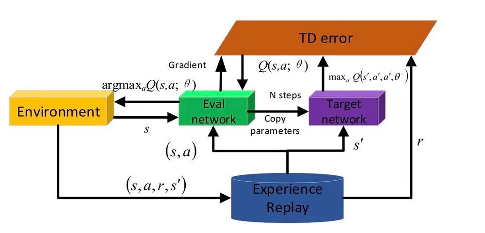 DQN的核心创新包括使用深度卷积神经网络(CNN)处理原始像素输入,模仿生物视觉系统的层次化特征提取能力。此外,为了解决传统强化学习在非线性函数逼近下的不稳定性,DQN引入了经验回放(Experience Replay)机制,通过存储并随机采样历史经验来打破数据相关性,提高训练稳定性。同时,采用目标网络分离技术,定期冻结目标Q网络的参数,减少训练过程中的波动。