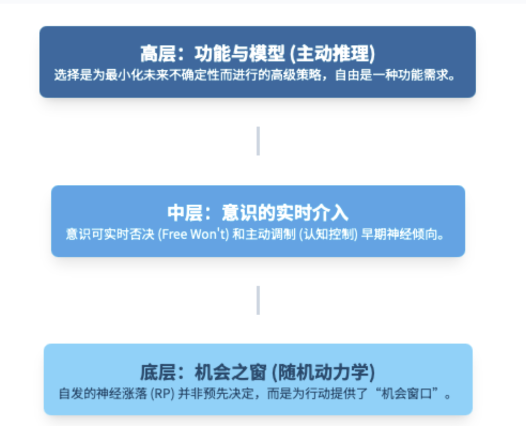 主动推理框架:则将大脑视为预测机器,认为生物体的根本目标是最小化自由能,即减少对世界感知中的“意外”或预测误差。个体可以通过更新内在模型(学习)或通过主动行动改变世界来实现这一目标。在这一框架下,自由意志被重新理解为一种高层级的策略选择,它通过贝叶斯推断来决定采取哪种行为,以最大化预测信息的增益并最小化未来的不确定性。