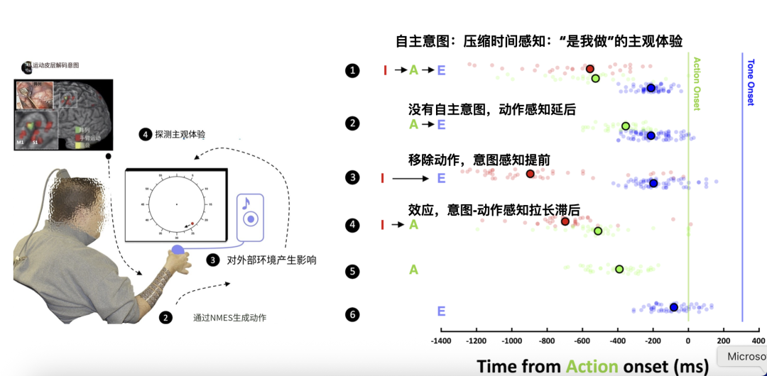 而2025年最新发表的脑机接口研究“意图动作绑定实验”[3]带来了决定性证据:通过脊髓损伤患者的大脑植入电极,研究者发现主观意图与神经元放电几乎完全同步,时差不超过120毫秒。更有趣的是,当用电刺激随机触发动作时,被试感觉动作发生得”更晚”;仅有意图而无动作时,意图感觉会”提前”,也就是说: