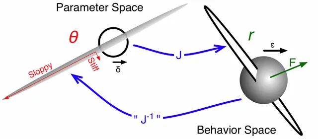 答案可能藏在系统生物学的一个重要发现中,James Sethna 提出的 Sloppy Models 理论揭示了一个惊人现象:即便一个系统有成百上千的参数,真正决定系统“行为空间”的往往只是极少数“敏感”的“参数空间”组合(称为“stiff”方向),而绝大多数参数(“sloppy”方向)即便大幅变化,对结果的影响也微乎其微。