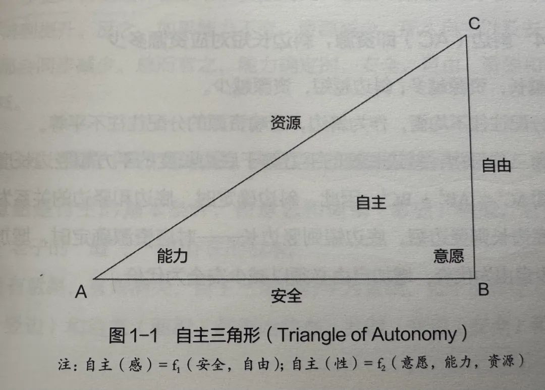 而后者,则可进一步几何化为一个自主三角形:意愿和能力分别是直角和锐角,资源,安全,自由构成三条边,整个三角形的面积就是一个人自主的大小。