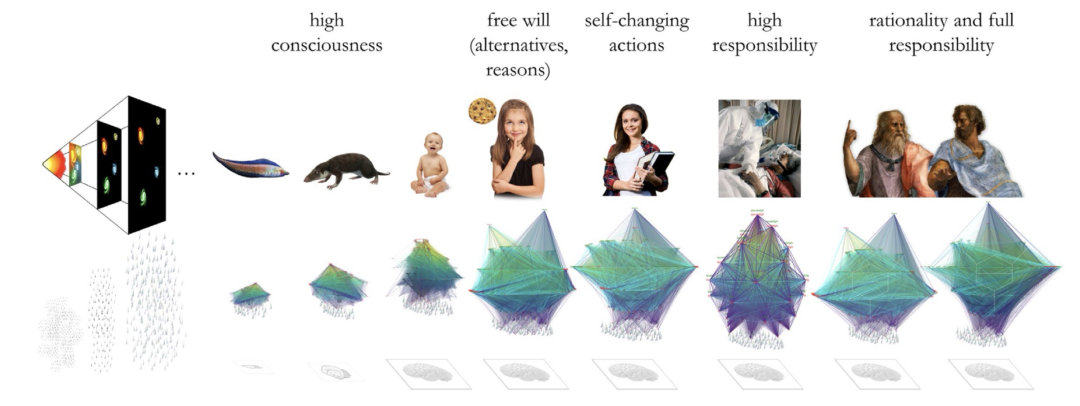 更有甚者,整合信息理论提出者 Giulio Tononi(IIT)甚至从本体论上认为所谓“因果内在实体”(intrinsic entities)才是宇宙实在而非物质实体[4]。根据 IIT,意识的存在是由大脑中最大的因果能力(cause–effect power)决定的,即唯有具有采取并产生差异因果能力的因果实体是真实的物理存在并能成为事件促因(即物质实体本身不能造成差异),从有意识观察者来看,在此外没有其它「内在」属性(如质量或电荷)。由此自由意志可以划分成了四个层级:反事实、溯因、决策、控制,分别代表想象的自由、评估的自由、意愿的自由以及执行的自由,每一层级都对应一种IIT中的Φ结构。而目前人类属于具有最高等级自由意志的因果实体,并且有可能通过实证确定这样一个对应意识的Φ的最大值主要在后部皮层区域。