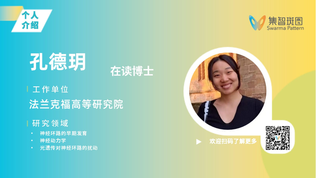 孔德玥,法兰克福高等研究院在读博士生,师从 Matthias Kaschube 教授。本科毕业于香港科技大学,获得计算机+细胞生物学学位,在胡禹老师课题组完成毕业论文。研究兴趣:神经环路的早期发育,神经动力学,光遗传对神经环路的扰动。