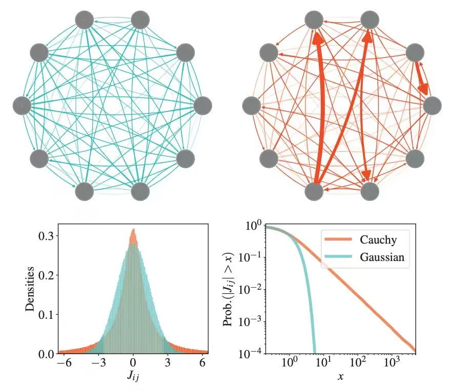 介绍:传统的RNN模型通常假设神经元之间具有强度服从高斯分布的全连接或者具有相同强度的稀疏连接。然而,实验和理论表明神经元之间的连接强度更接近重尾(heavy-tailed)分布。由于重尾分布的二阶矩通常发散,常规的分析理论如动力学平均场(dynamic mean-field)和扩散近似不再适用。所以,重尾神经网络的动力学与经典的高斯或稀疏均匀神经网络完全不同,将经典 RNN 理论推广到重尾 RNN 对连接理论与实验结果具有重要意义。在这一部分,我们将回顾关于重尾 RNN 动力学的文献,对比高斯网络和重尾网络的动力学,并讨论这些理论结果在神经科学背景下的意义和其他开放问题。