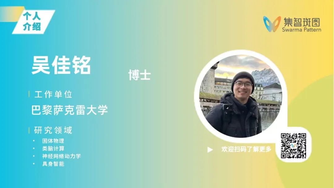 吴佳铭,巴黎萨克雷大学物理学博士,师从 Marcelo Rozenberg 教授,研究兴趣:固体物理、脑计算、神经网络动力学、具身智能等。