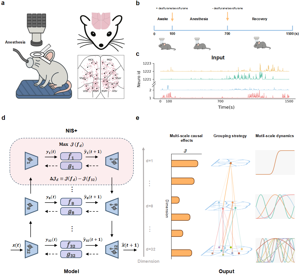 意识横跨宏观体验与微观神经活动,但连接这两个尺度仍具挑战性。现有主流理论(如整合信息理论)往往聚焦单一尺度,忽视了因果效力及其动力学如何在跨尺度上展开,以及这些过程如何依赖于信息整合。研究进展受限于跨尺度数据的匮乏,以及量化多尺度因果关系与动力学的困难。在此,我们提出一个用于多尺度动力学分析的机器学习框架,并将其应用于小鼠背侧皮层在清醒、麻醉和恢复状态下的近细胞分辨率钙信号数据。该框架通过学习层级因果变量,量化跨尺度因果效应、动力学过程及信息整合。微观层面信息的全局整合产生了潜在宏观变量,这些变量生成多尺度因果效力。当因果效力达到峰值时,一个表征意识状态的一维宏观变量随之涌现,在清醒状态下呈现亚稳态鞍点动力学特征,而在麻醉状态下则坍缩为局部化的低因果状态。这些发现建立了一个连接神经活动与意识状态的层级因果框架。