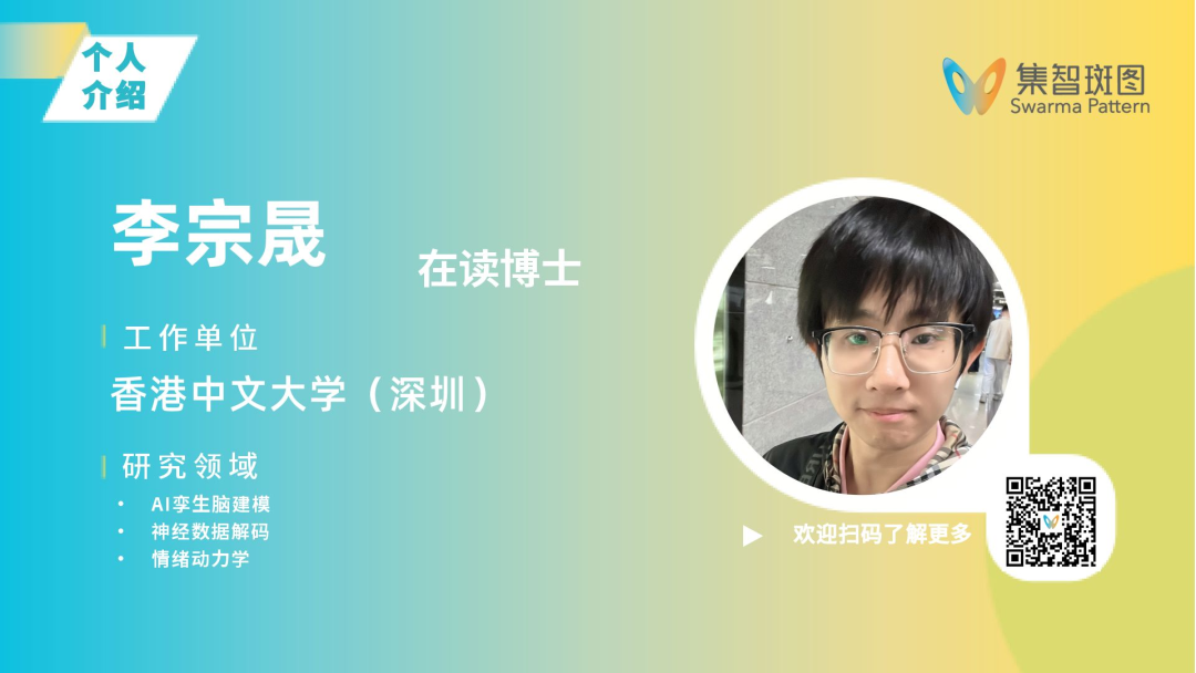 李宗晟,香港中文大学(深圳)在读博士,师从南方科技大学刘泉影教授,本科毕业于大连理工大学,硕士毕业于南洋理工大学。在广东省智能科学与技术研究院陈洛南老师的实验室完成科研助理的短暂轮转后,现聚焦于人工智能与神经计算方向。研究兴趣包括 AI 孪生脑建模,神经数据解码,情绪动力学等。