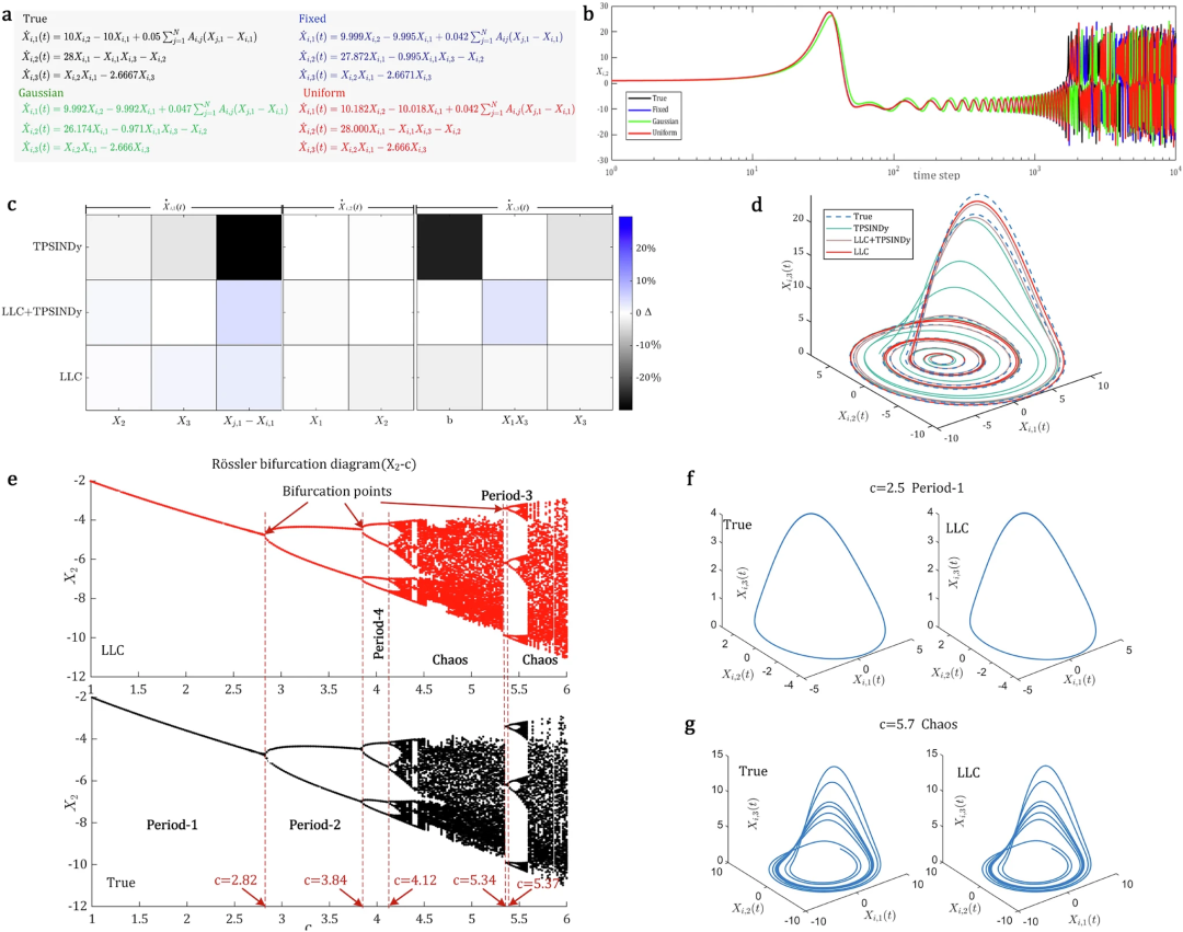 图5:推断混沌系统动力学的结果。a. 在不同初始条件下,我们的LLC推断的控制方程的比较,对耦合Lorenz系统。b. 由不同初始条件下LLC推断的方程产生的同一初始值的吸引子预测状态的比较。c. 每个方法在Rössler系统上推断的方程与真实方程之间系数误差的比较。d. 由TPSINDy、LLC和LLC+TPSINDy推断的控制方程生成的同一吸引子的状态比较。e. 通过Poincaré截面方法得到的Rössler系统的分岔图,横轴表示参数c(范围从1到6),纵轴表示吸引子第二维度状态(Xi,2) 。发现的方程展现出与真实方程相同的周期倍增和混沌现象。f. 在周期1时的极限环比较,即c=2.5。g. 在c=5.7时的混沌比较。