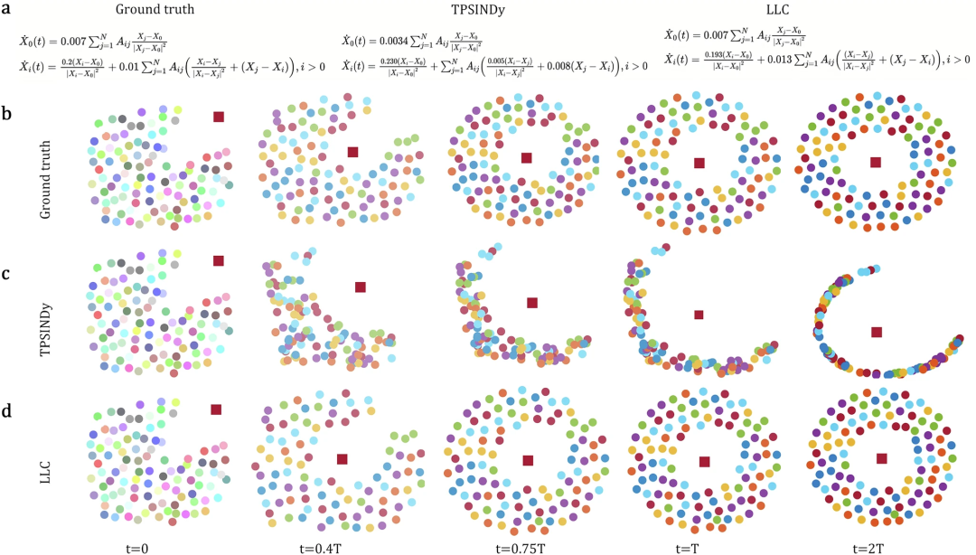 图4:推断捕食者-猎物(PP)系统的结果。a. 各种方法推断的控制方程的比较。b. 随时间变化的捕食者(方块)和猎物群(点)的真实位置。c. 由TPSINDy推断的控制方程生成的预测位置。d. 由LLC推断的控制方程生成的预测位置。