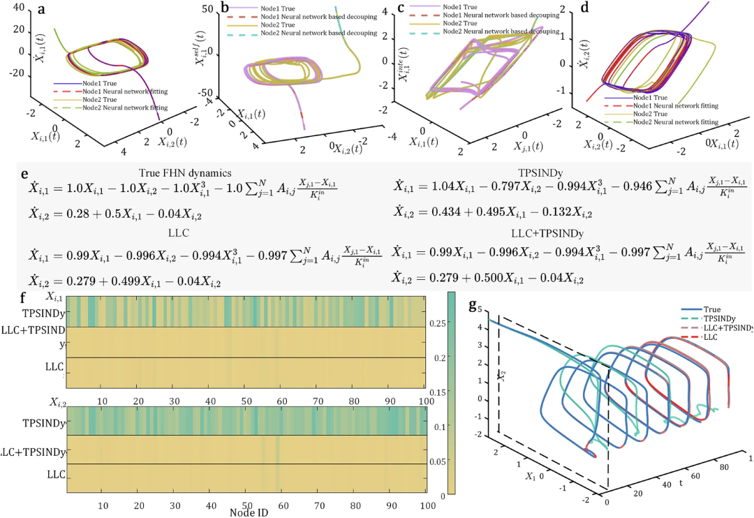 总之,LLC提供了一种高效准确的解决方案,通过信号解耦和预训练符号回归,揭示了从生物到混沌系统的动力学方程。它在噪声和不完整数据下的鲁棒性,以及在多维异质系统中的通用性,展示了其推动科学发现的潜力。然而,挑战仍存,如未知拓扑结构和外部扰动。未来,可扩展到非确定系统(non-deterministic systems)和高阶交互(higher-order interactions),甚至与大语言模型(large language models, LLMs)结合,助力AI代理决策。这项工作如一个“数字培养皿”,为应对新疫情或气候变化铺平道路。