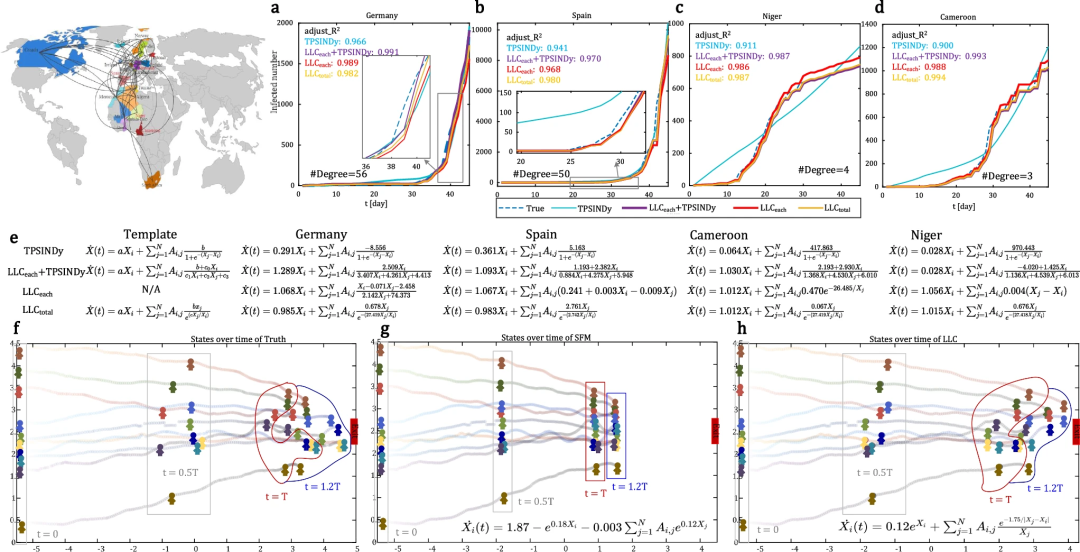 图6:推断真实系统动力学的结果,包括全球COVID-19传播和行人动力学。a–d. 各种国家或地区随时间变化的病例数比较,由TPSINDy、LLCeach+TPSINDy、LLCeach和LLCtotal生成。e. 四个代表性国家或地区的各种方法推断的控制方程的比较。请注意,LLCeach+TPSINDy中的模板是我们LLC为每个节点生成的方程的归纳。f. 随时间变化的真实行人运动轨迹,其中T之前的数据用于学习。g. 使用主流社会力模型(SFM)对行人动力学的推断结果。h. 使用我们的LLC对行人动力学的推断结果。