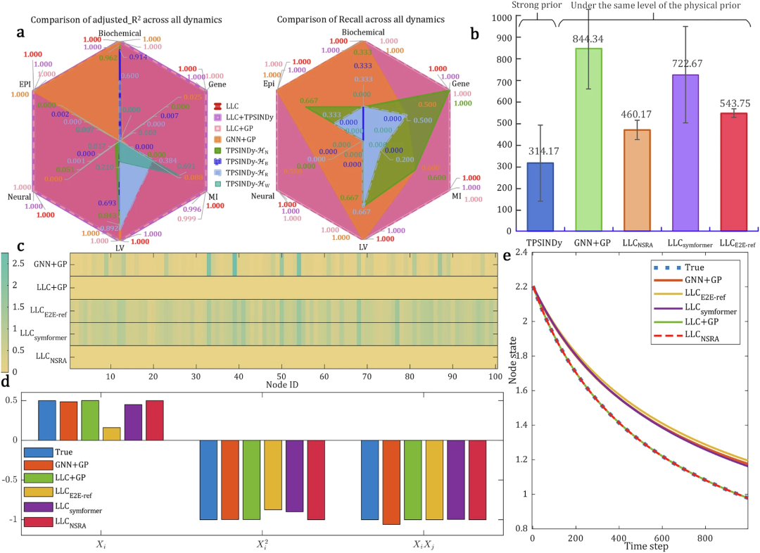 图2:推断一维同质网络动力学的结果。a. 在六个场景中,对预测准确性(adjusted R²分数)和发现方程(Recall)的比较。TPSINDy的结果高度依赖其函数项的选择,LLC在所有网络动力学场景中显著优于比较方法。b. 各种方法在所有动力学上的平均执行时间比较。请注意,TPSINDy需要强先验,即自身和交互动力学的可分解性,以及预定义的正交基本函数项。相比之下,其他方法基于相同水平的假设,即仅需可分解性。通过结合基于Transformer的预训练符号回归,LLC在效率和准确性之间实现了良好平衡。c. 在LV场景中,由发现的控制方程产生的预测结果与真实结果之间的归一化估计误差(Normalized Estimation Error, NED)。d. 各种方法发现的控制方程中拟合系数的比较。e. 单个节点的状態预测曲线的比较。