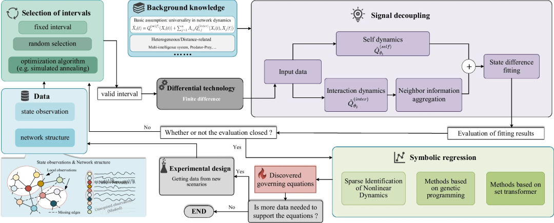 ,用于解耦网络动力学信号并实现变量减少,直到满足拟合要求。在获得良好拟合的神经网络后,使用符号回归技术高效解析它们的近似白箱方程。当然,如果需要额外观测数据来支持发现,可以重新审视实验设计,直到获得满意的网络动力学控制方程,从而打破循环。