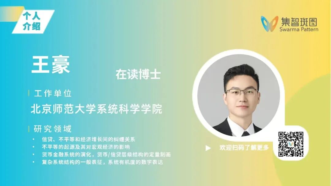 王豪,北师大系统科学学院23级博士(硕博连读),导师为王有贵教授,专业为系统理论(社会经济系统方向)。博士论文研究方向为信贷、不平等和经济增长间的纠缠关系。其他研究兴趣为不平等的起源及其对宏观经济的影响;货币金融系统的演化,货币/信贷层级结构的表征和定量刻画;复杂系统结构的一般表征,系统有机度的数学表达。