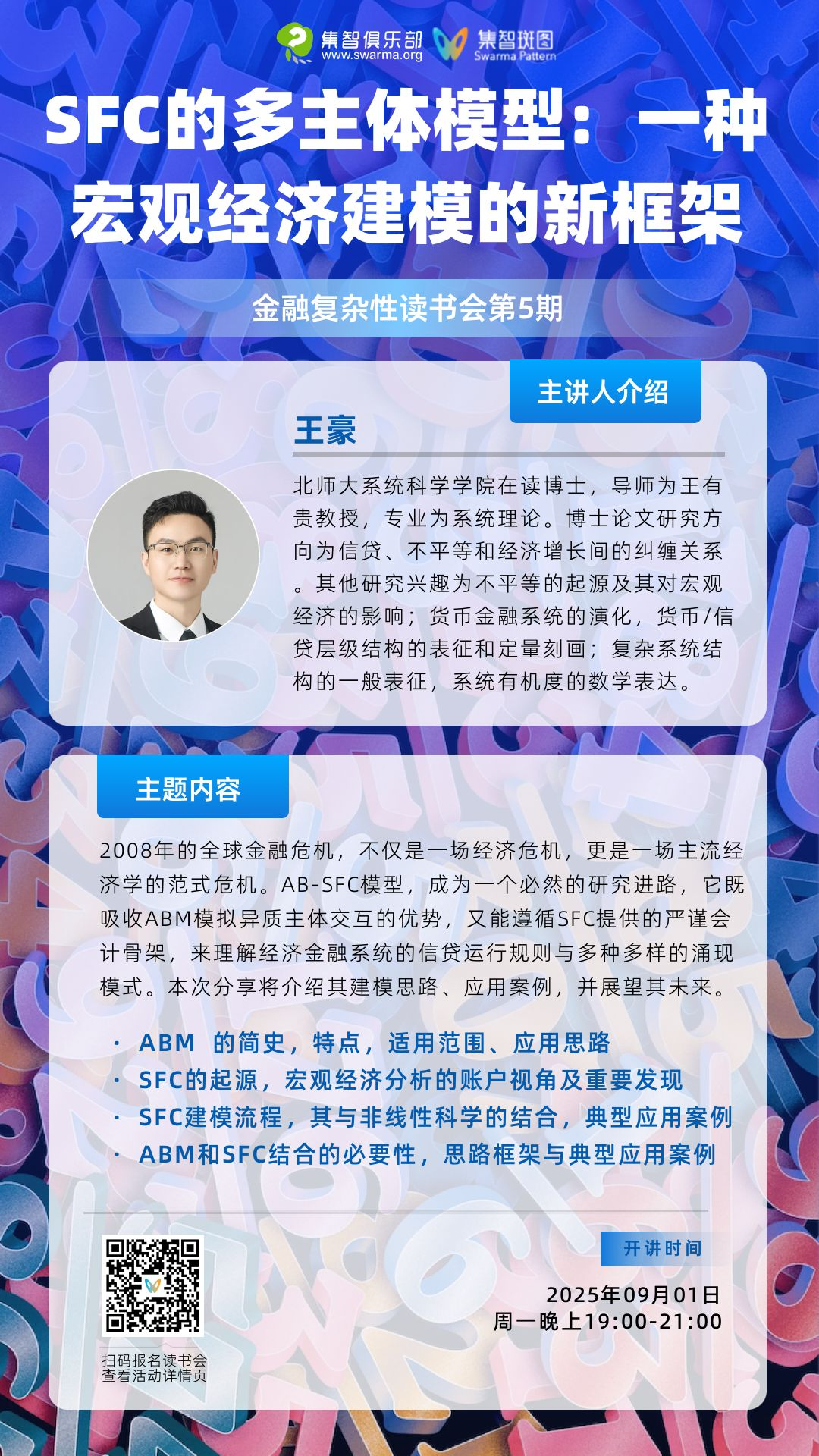 9月1日(周一)19:00将由北京师范大学系统科学学院在读博士王豪开启第五期分享“存流量一致的多主体模型: 一种宏观经济建模的新框架”,讲解吸收了ABM和SFC优势的AB-SFC模型,它的建模思路与应用案例,以及如何来理解经济金融系统的信贷运行规则与多种多样的涌现模式。