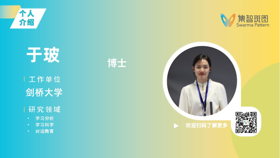 于玻,北京师范大学学士及硕士,剑桥大学博士生,研究方向包括:学习分析,学习科学,对话教育,AI在教育中的应用,计算机支持的协作学习等。