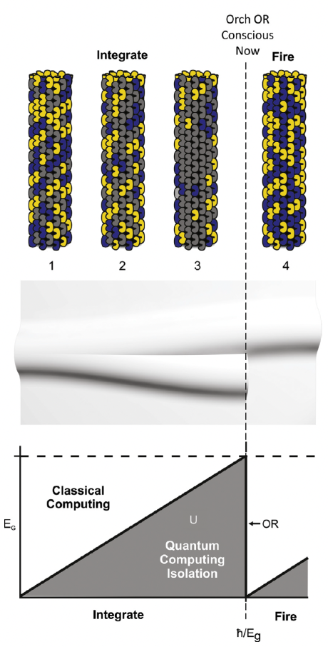 图4:Hameroff 和 Penrose [2014] 图示了 Orch OR 发生的过程。顶部:微管蛋白处于经典偶极状态(黄色或蓝色),或者处于两种偶极状态的量子叠加状态(灰色)。在(1-3)期间,量子叠加/计算增加。当在时间 τ≈h/EG 达到阈值时发生意识瞬间。中部:相应的另类叠加的时空曲率在OR时达到阈值并选择一个时空曲率。底部:意识 Orch OR 事件的示意图显示了量子叠加的U型演变和增加的EG值到达到OR阈值,而 τ≈h/EG时发生意识瞬间。