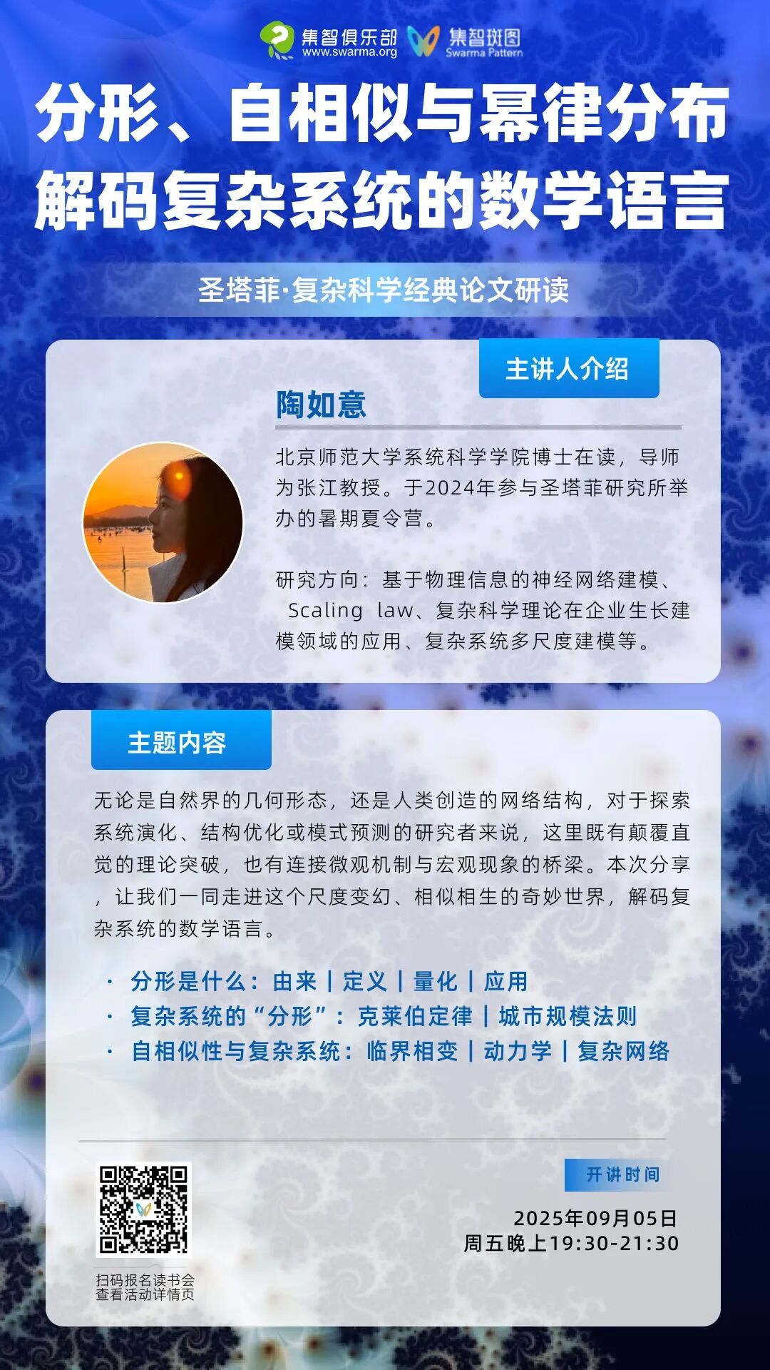 本次分享,将带你进入尺度变幻、相似相生的奇妙世界:从海岸线的分形,复杂网络拓扑结构的自相似,到复杂系统的数学语言规模法则。欢迎预约直播观看👇