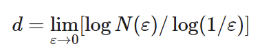 不同的分形系统有着不一样的分形维数。分形维数的计算如下式所示,是描述分形的一个重要参量。它的含义便是,你用一个盒子(平面上便是一个小正方形或圆)去覆盖一个个分形体。随着盒子半径的变化,覆盖的分形体数量也会以幂律的关系发生变化,这里的幂律指数便是分形维度。