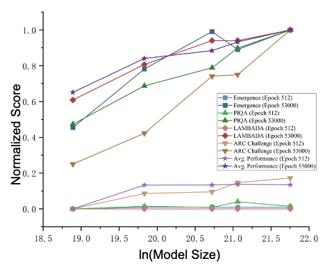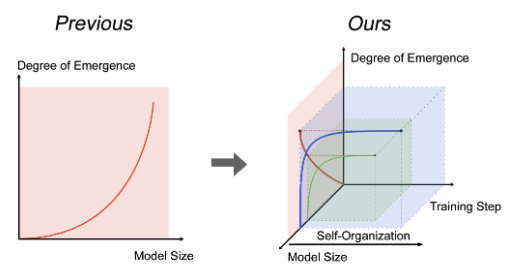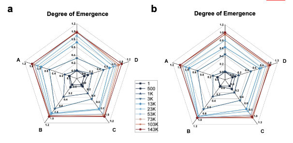 观察生物界的这些案例,我们发现,出现涌现现象不只是因为一个系统很大,更在于组成单元之间要有复杂的交互。同样的道理,在研究LLM的涌现时,我们也不应只关注模型的规模,而是应当关注神经元之间的交互作用。这正是肖熊烨团队在新研究工作中所强调的。除了关注模型大小的变化,他们还关注涌现程度随训练次数的变化。