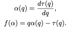 这里的幂律指数Τ(q)被称为质量指数。经过勒让德变换,便可以进一步得到利普希茨-霍尔德指数α(q)和多重分形谱f(α),其计算公式分别如下所示,