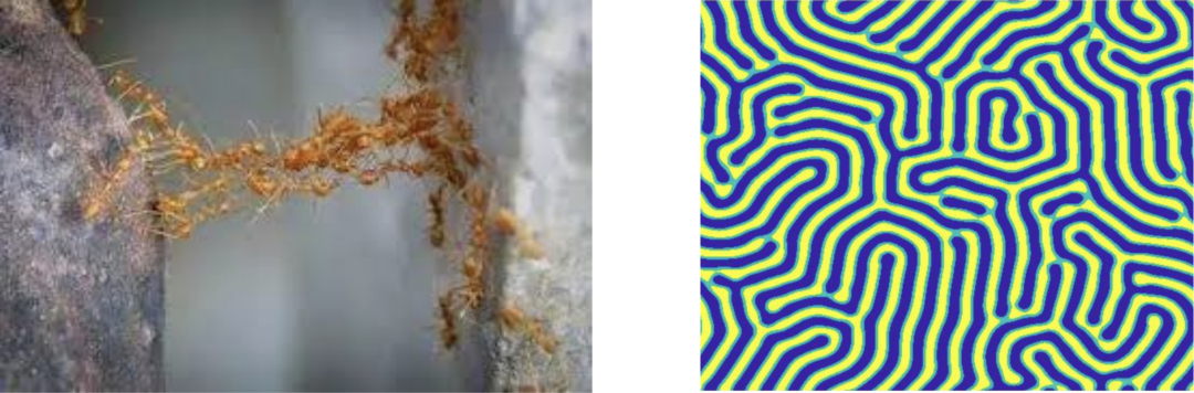 讨论这样的话题,我们首先需要对涌现(emergence)这一概念本身进行阐述。根据Goldstein在1999年给出的说法,“涌现是指在自组织过程中出现新颖且连贯的结构、模式和特性”。单看这样一个定性的定义,涌现实际上与自组织(self-organization)过程有关。自组织同样是复杂性科学中的一个重要概念。自组织是指一个集体系统驱动自身走向更有序状态,并在面对扰动时保持其功能的能力。比如团结的蚁群,自发生成的图灵斑图等,都是自组织的典型案例。它们都是在没有外部设计的情况,通过微观个体彼此交互,从而在系统层面产生了超越所有个体的宏观性质。
