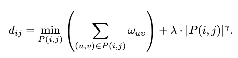 从公式中可以看出,该距离由两部分组成,第一部分是考虑连边权重的最短距离,而另一部分则是路径节点数量。超参数