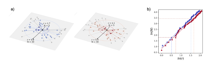 对于一个阈值(半径)来说,邻居数量可以说是一个盒子(圆)所覆盖的“质量”。下图a中便是在展现,随着盒子半径(r)增大,其覆盖的质量也一定在增大。而在真实实验中观察到,质量与半径呈现出一种幂律关系(如图b所示)。这说明,我们可以假设神经网络中存在着分形结构。