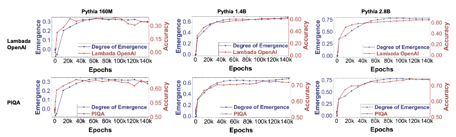 另外,文章中将涌现度指标与两个公认的下游任务性能基准(Lambada OpenAI 和 PIQA)进行比较,发现它们之间有很强的相关性。