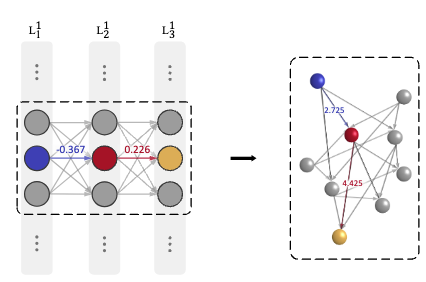 为了能对AI的结构进行分析,我们要将一个LLM转化为一个神经交互网络(Neuron Interaction Networ,NIN)。NIN是一个有向图,图中的节点就是人工神经网络里的神经元,而连边上的权重则是原始权重的绝对值的倒数ωab = |wab|-1——即原始权重越小,表示两个神经元之间的距离越大。转换过程如下图所示。