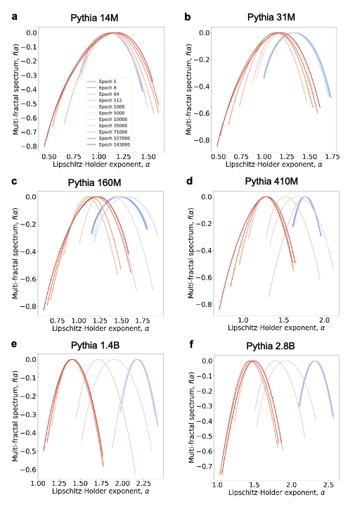 下图展示了对不同规模的 Pythia 系列模型(从14M到2.8B参数)在训练过程中的内部网络结构演变进行的可视化分析。每张子图的横轴是利普希茨-霍尔德指数,纵轴是多重分形谱。从蓝色的线到红色的线,代表着训练迭代次数越来越多。