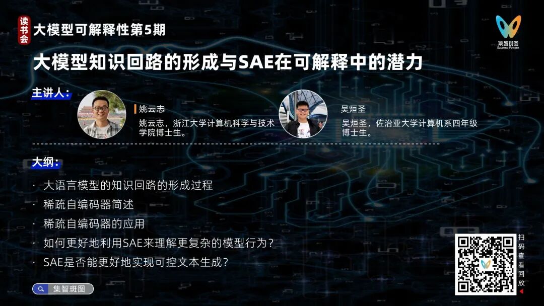 分享简介:本次分享姚云志博士系统梳理了大模型知识回路的形成历程,从 2020 年 OpenAI 的视觉神经元关联研究到2024年Anthropic的大模型行为解释,揭示回路发展中的多义性挑战及通过稀疏自编码器实现的特征解耦方案。他通过构建虚构实体数据集验证回路形成机制,发现高频知识更易建立稳定回路。吴烜圣博士重点解析稀疏自编码器(SAE)在大模型可解释性中的应用:利用归因图定位模型决策逻辑,通过特征消融实验验证回路因果关系;在分类任务中约束敏感特征以消除偏见,并在生成任务中增强安全特征防止有害输出;案例显示SAE能解析模型早期规划能力,如押韵诗句生成时提前确定韵脚词,并成功干预攻击性内容的生成路径。