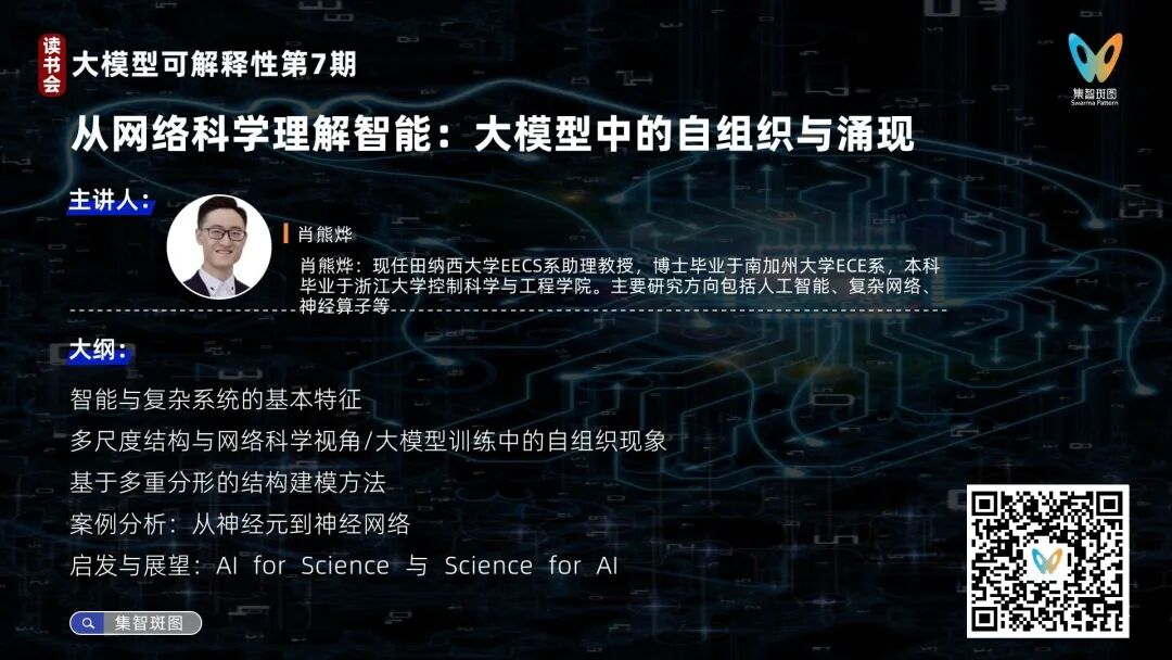 分享简介:肖熊烨老师从复杂网络与多重分形分析的视角,探讨了大模型的结构演化与智能涌现机制。他以神经元交互网络为切入点,提出通过分形维度分析网络的多尺度复杂性,结合扭曲因子Q量化不同结构的缩放规律,揭示模型内部自组织与功能涌现的关联性。研究发现,大模型规模的扩大引发网络谱图左移和拓扑复杂度变化,对应智能的相变式跃升,类似于自然界中材料、脑网络的结构-功能映射规律。该方法可应用于材料设计、脑科学及AI模型的结构优化,未来计划探索模型结构安全边界、幻觉生成机制及人脑与AI的智能生成共性,为可解释性研究提供网络科学范式支撑。