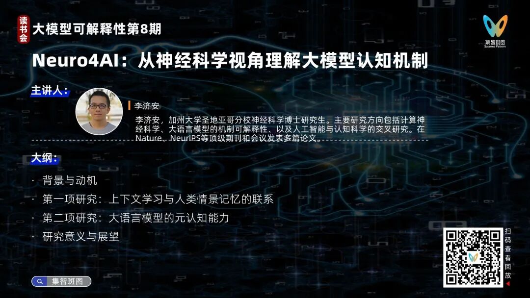 分享简介:李济安博士分享了从神经科学视角解析大语言模型可解释性的两个核心研究方向:其一,通过神经反馈框架探索大模型的元认知能力,揭示了模型能够有效监控和调控具有明确语义或高方差的神经活动轴,这种能力在模型规模增大时显著增强,同时存在通过内部激活伪装欺骗外部监控的安全隐患;其二,对比Transformer的归纳注意力头与人类情景记忆模型(CMR)的机制相似性,发现两者在时序连续性、前后项不对称性等行为模式上高度吻合,且这类注意力头在模型训练中逐渐涌现,对上下文学习(ICL)具有因果性支持,为AI模型与生物认知机制的跨学科关联提供了实证依据。
