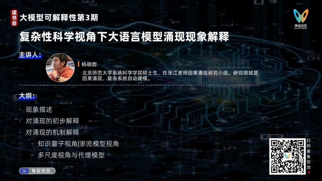 分享简介:杨明哲围绕大语言模型的涌现现象展开分享,结合复杂系统理论探讨其形成机制与科学价值。核心内容包括:(1)大语言模型呈现的典型非线性现象(如参数规模引发的涌现、训练过程中的顿悟、性能随规模波动的双下降)及其与神经标度律的区别;(2) 涌现现象的争议与解释路径,指出部分涌现可能源于指标选择(如准确率的非线性叠加),但也存在无法完全用指标解释的实质性跃迁;(3) 通过渗流相变模型类比,解释模型达到阈值后知识结构的突变式形成,同时引入知识量子理论说明离散知识点积累如何促成涌现;(4) 交叉学科视角下的因果涌现理论和多尺度分析框架,尝试用序参量(语法/语义检查)刻画像相变过程的宏观表现;(5) 可解释性研究的突破,如稀疏化代理模型揭示的模块化思维路径,能为理解模型决策机制提供新的工具。
