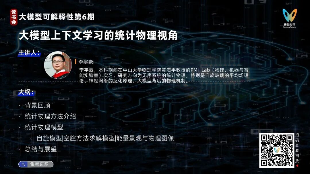 分享简介:本次分享主要从统计物理视角解析大语言模型的上下文学习(ICL)机制,通过建立损失函数与哈密顿量的映射关系,将自旋玻璃理论中的平均场方法和 Hopfield 模型等物理工具引入分析框架。主讲人探讨了线性注意力机制的简化模型如何通过隐式梯度或贝叶斯推断实现高效学习,并对比了预训练、微调的高成本与上下文学习的低资源优势;同时结合协方差建模与Hessian矩阵分析,揭示了数据关联性对模型泛化能力的影响及能量景观动态演化规律,为理解大模型工作机制提供了物理层面的理论支撑。