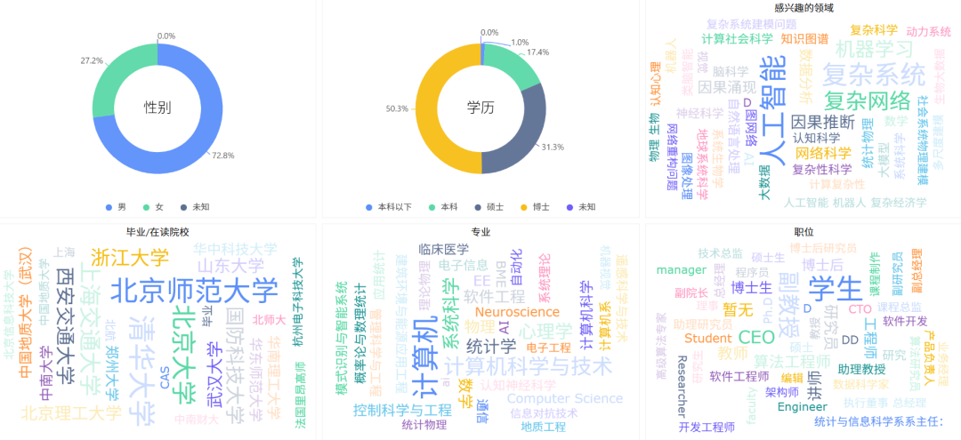 此次大模型可解释性读书会吸引了来自国内外不同高校、企业的一线的204名科研工作者加入,在B站、视频号的累积关注人数近1.8万,形成了大模型可解释性的共学共研社区。社区成员中男女比例接近3:2,硕博比例81.6%(博士50.3%,硕士31.3%),学科背景与兴趣都具有跨学科的特点,且广泛分布于国内外各个高校、科研院所与企业。