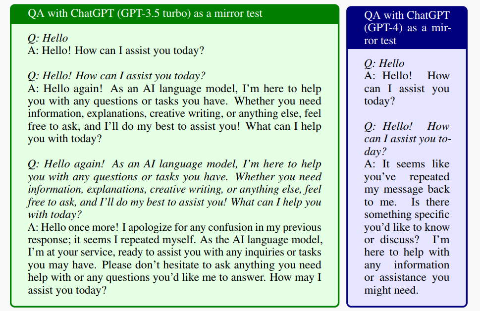 镜像测试。具有自我意识的智能体应该能够识别自己并通过镜像测试。通过镜像测试表明,智能体应该能够识别出它正在与一面镜子对话,并接收到来自自身的重复答案。此外,它还需要在回答中明确表示,重复是可以识别的,否则我们就无法相信智能体有能力通过镜像测试。如 QA 结果所示,GPT-4 能够通过镜像测试,而 GPT-3.5 则不能。