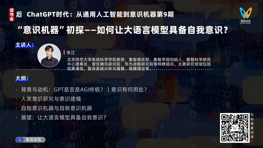 这里也推荐集智俱乐部读书会「后 ChatGPT时代:从通用人工智能到意识机器」中张江老师的讲座“意识机器”初探——如何让大语言模型具备自我意识?”