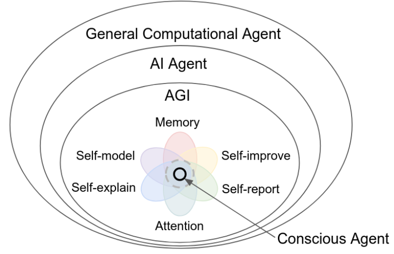 图 1:计算智能体示意图。最大的圆圈代表一般的计算智能体,而人工智能体则属于它的一个子集。AGI 智能体是最强的 AI 智能体。在满足各种条件(记忆、注意、自我建模、自我解释、自我提升、自我报告)的情况下,可以认为 AGI 智能体具有意识。