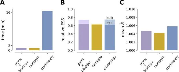 A) 运行时间对比;B) ESS/抽样总量;C) 平均。NumPyro≈PyMC(BlackJAX) –> 比 Stan 快 ~16×。用 JAX 后端的 PPL(NumPyro / PyMC)既快又稳,是首选实现。