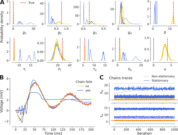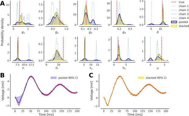图2 推理过程中多模态出现。同一个推断过程会跑出多组截然不同的参数。多模态=收敛到不同峰;只有落在正确模态的链才重现真实动力学。蓝色链→局部极值、拟合差;黄色链→全局模态、拟合好;浅蓝链→非稳态直接踢掉。A) 24 条 NUTS 链在后验空间的分布;B) 拟合好的 vs 落到局部最优的链在时间域的动态;C) 链的稳态检查。