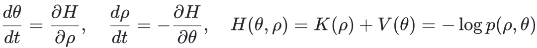 其中K(ρ)表示动能(通常假设为高斯形式),V(θ)为势能,对应目标分布的负对数。