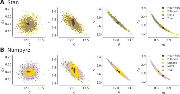 图6 VI 与 NUTS 后验对比。选取的若干关键参数,两两绘制散点密度。NUTS(浅棕)、自动 Laplace (紫灰)、Full‑rank ADVI(黄)、Mean‑field ADVI(深棕)。红点:真实生成参数位置。NUTS后验形状椭圆/弯曲,跟随相关结构,黄金标准,几何捕获最完整,但计算较慢。