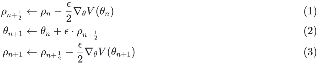 为了在有限计算步数内近似连续轨迹,HMC 使用 Leapfrog 积分法进行数值模拟,其更新规则如下: