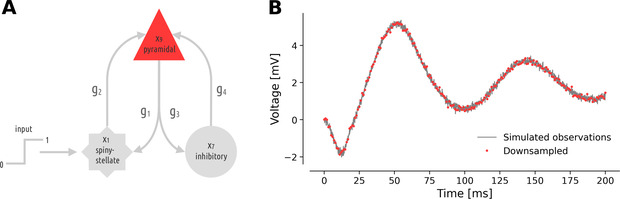 图1 动态因果模型(DCM)示意例。(A)展示了用于产生事件相关电位(ERP)的简化神经质点模型,包括三个互相连接的神经元种群:兴奋性锥体神经元(Pyramidal cells)、抑制性中间神经元(Inhibitory Interneuron)和接收外部输入的有棘星状细胞(Spiny stellate)。这些神经群体通过若干连接参数耦合在一起,外部刺激作为输入驱动系统(见黑色箭头所示因果关系)。(B) 模型仿真生成的锥体神经元电压信号(灰色曲线)及加入观测噪声并下采样后的观测数据(红点)。研究人员以此虚拟模型作为测试案例,用来评估不同推断方法对已知参数的恢复能力和对观测数据的拟合准确度。