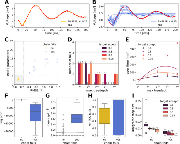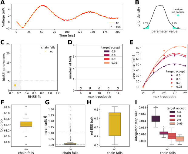 A) 80 条“尾部初始化”链全部拟合成功;B) 初始化示意;C–D) RMSE 和失败链=0;E–I) 同 Fig 3 的诊断指标。把初始点丢到先验 2.5% 尾区 ⇒ 100% 收敛,且探索更大胆(步长大)。先验尾部起步是一键稳收敛的简洁技巧。
