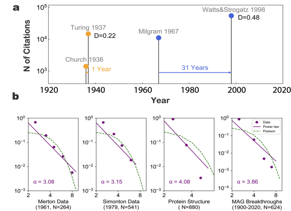 图2:不同数据集中科学突破的时间间隔符合幂律分布